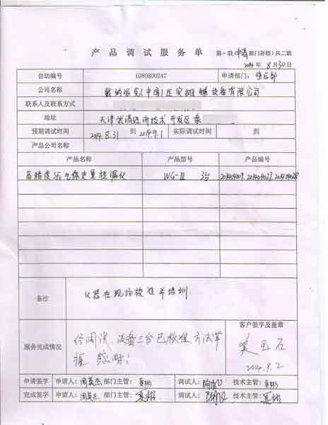2014-08-31  戴納派克(中國)壓實(shí)攤鋪設(shè)備有限公司進(jìn)行調(diào)試服務(wù),調(diào)試產(chǎn)品:CYWG-III高精度SF6氣體定量檢漏儀